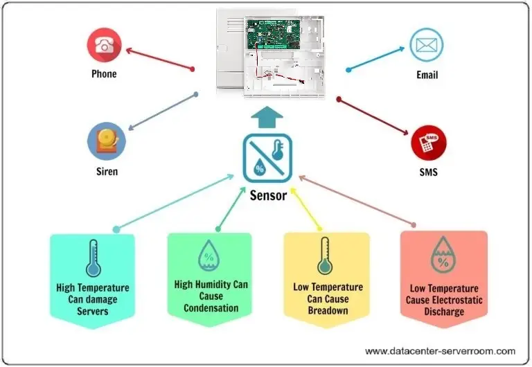 Environmental Monitoring System (EMS) monitor temperature, humidity, water leakage and heat /smoke detector/sensor. If the sensors programmed thresholds triggered or sensors go into alarm condition, the controller will trigger a local alarm